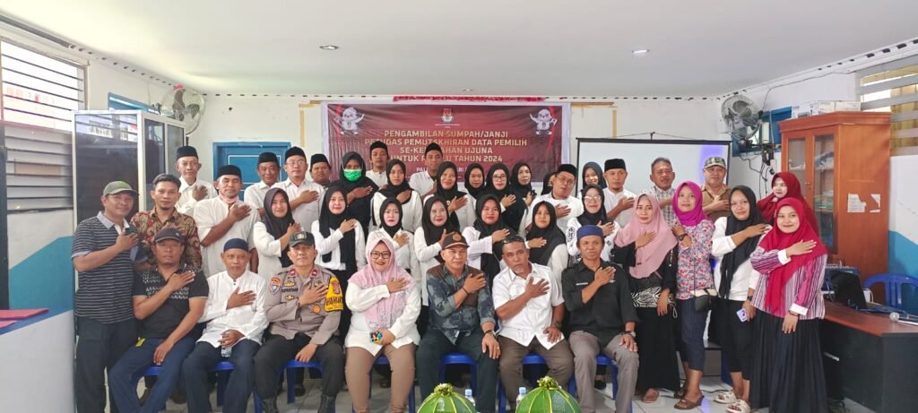 Sejumlah Petugas Pemutakhiran Data/Pantarlih Pemilihan Umum tahun 2024 Kelurahan Ujuna dilantik pada Minggu, (12/02/2023). Pelantikan ini dilaksanakan di Baruga Kelurahan Ujuna, dihadiri Lurah Ujuna Reenas S.Sos., PPK kecamatan Palu Barat Eka fitriah, Panwas Kecamatan Palu Barat Rika, Bhabinkamtibmas Kelurahan Ujuna Supratman, RT-RW se-kelurahan Ujuna serta Pantarlih Kelurahan ujuna. Kegiatan ini diawali dengan pembacaan surat keputusan komisi pemilihan umum Kota Palu no 49 tahun 2024 tentang penetapan dan pengangkatan Petugas Pemutakhiran Data pemilih pada Kelurahan Ujuna Kecamatan Palu Barat lalu pengambilan sumpah/janji yang dibacakan oleh ketua PPS kelurahan Ujuna Edi Lugito. Kemudian diikuti agenda selanjutnya yakni penandatanganan berita acara dan pengambilan sumpah/janji, dandiakhiri dengan pemberian selamat kepada pantarlih Kelurahan Ujuna yang baru saja dilantik dan akan segera bertugas pada Pemilu 2024 mendatang.