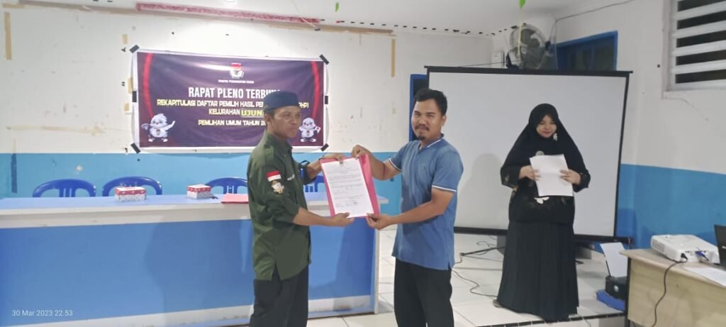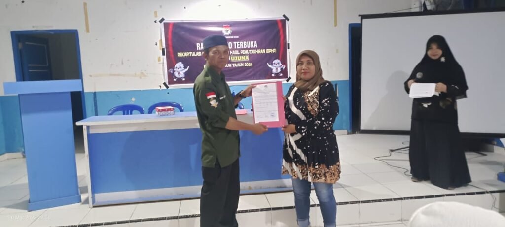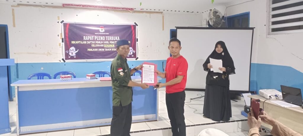 Berdasarkan Peraturan Komisi Pemilihan Umum Nomor 7 tahun 2023 tentang perubahan atas peraturan Komisi Pemilihan Umum nomor 2 Tahun 2022 tentang penyusunan daftar pemilih dalam penyelenggaraan pemilihan umum dan sistem informasi data pemilih, dan Surat Keputusan Komisi Pemilihan Umum nomor 27 tahun 2023 tentang pedoman teknis penyusunan daftar pemilih dalam negeri pada penyelenggaraan pemilihan umum, PPS Kelurahan Ujuna laksanakan rapat pleno terbuka Rekapitulasi Daftar Pemilih Hasil Pemutakhiran (DPHP) Tingkat Kelurahan Ujuna pada Pemilihan Umum 2024, Kamis (30/03/2023). Di laksanakan di Baruga Kelurahan Ujuna, Jl. S. Gumbasa, Rapat ini dihadiri Panwas Kecamatan Palu Barat dan perwakilan saksi dari masing-masing partai politik.
