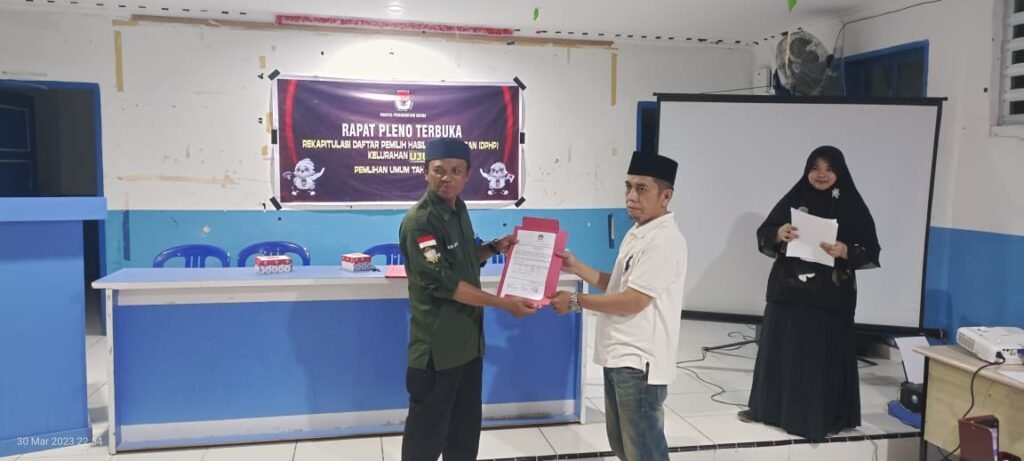 Di awali dengan pembacan rekapitulasi daftar pemilih hasil pemutakhiran oleh Ketua PPS, rapat pleno ini berjalan tertib dan lancar diikuti sesi tanya jawab dan diakhiri dengan penandatanganan berita acara rapat pleno terbuka.